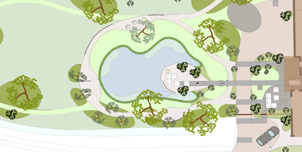 - Speelse, groene houtwallen rondom de vijver bieden subtiele privacy zonder het gevoel van openheid te verliezen