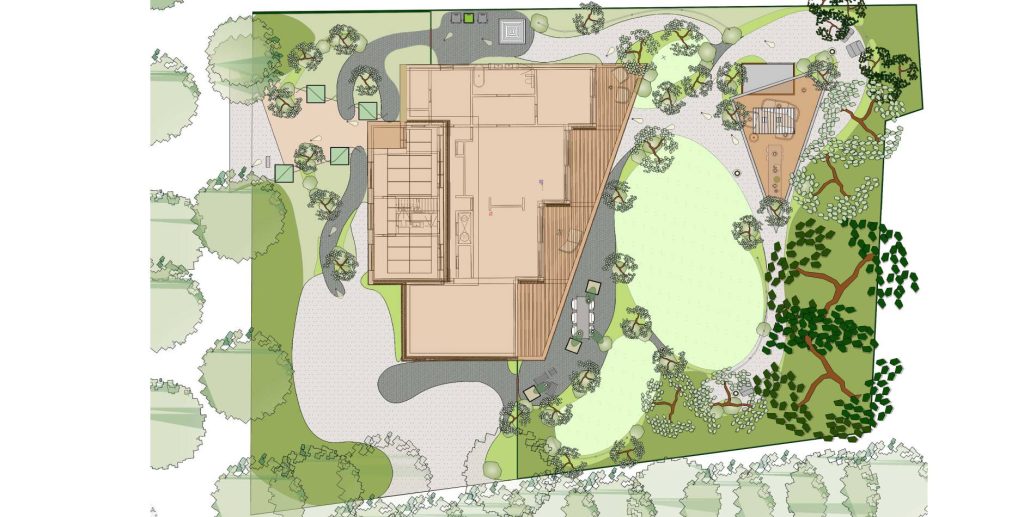 Centraal in het plan staat de samenhang tussen de woning, het nieuwe bijgebouw en de tuin. Het bijgebouw biedt ruimte voor berging en een overdekte lounge met buitenkeuken, waar het goed toeven is, ongeacht het seizoen. Deze plek vormt een tweede leefruimte in de buitenlucht — beschut, maar met vrij zicht op het groen.